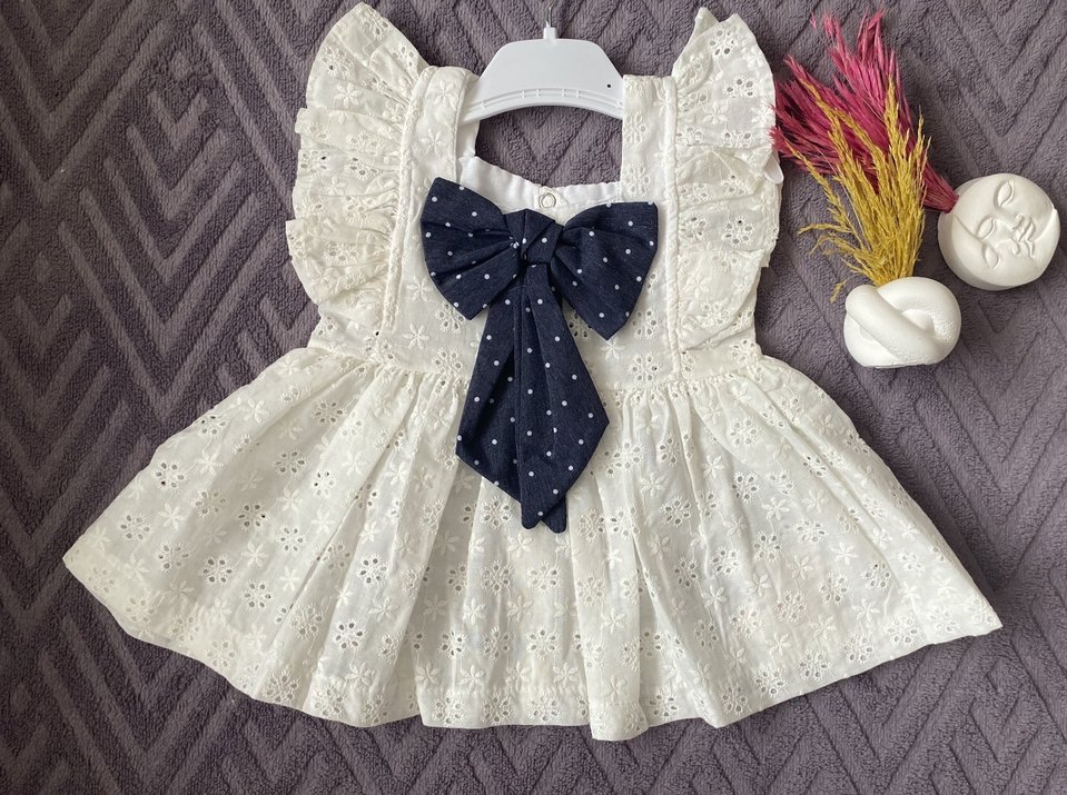 Nakışlı beyaz kolsuz, fiyonk detaylı, bohem tarzda kız çocuk elbisesi. Geniş kesimi ve halter yakasıyla rahat kullanım sağlar. 6 ay 2 adet / 12 ay 1 adet / 18 ay 1 adet / 24 ay 1 adet kalmıştır ürün yeni ve etiketlidir