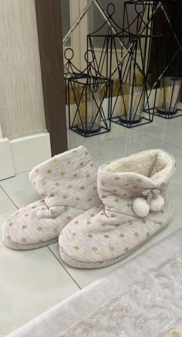 Nakışlı pastel desenli beyaz kız çocuk ev botu, yumuşak ve sıcak tüylü iç yüzeye sahip. Modern ve rahat tasarımda, ponpon detaylı. ❄️