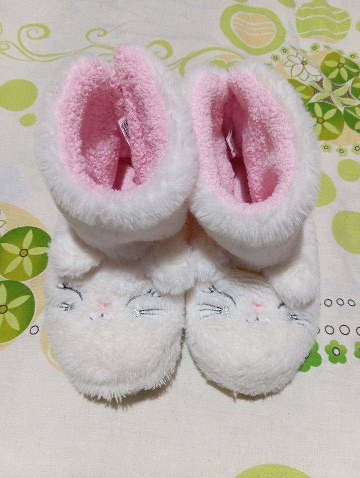 Nakışlı detaylara ve kürk detaylı beyaz kız çocuk ev terliği, içi pembe yumuşak kumaşla kaplıdır. Rahat ve sıcak tutar. 33/34 numara