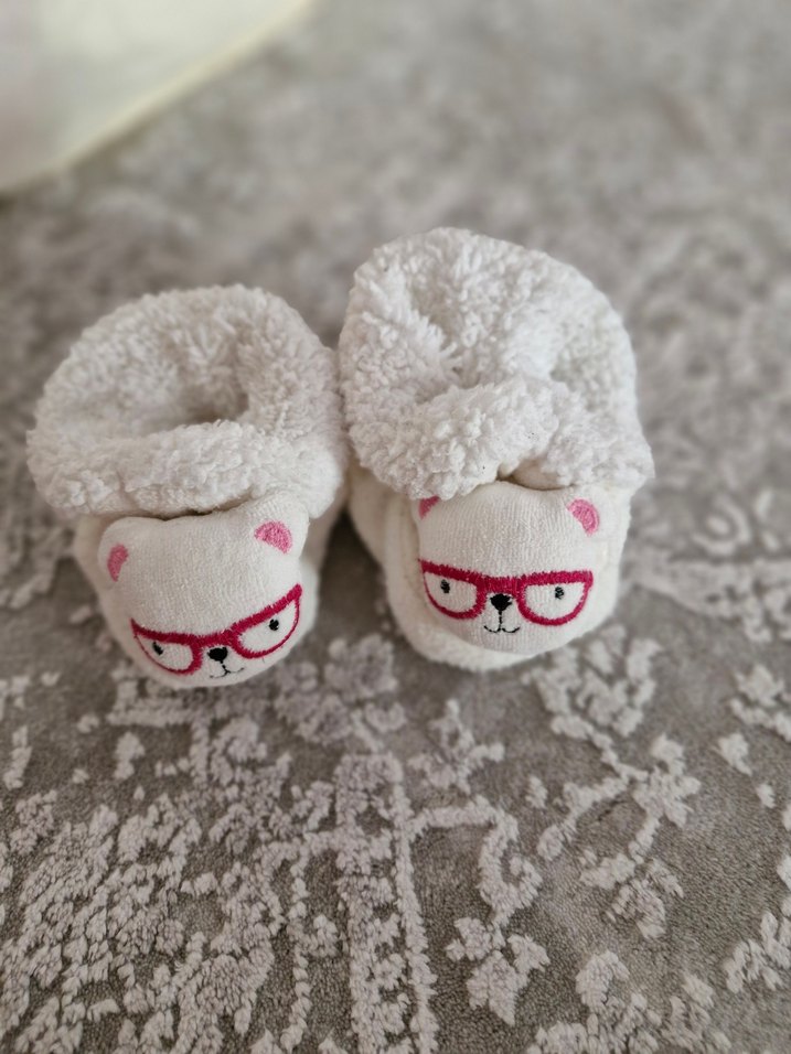 Nakışlı renkli detaylara sahip beyaz, örgü kız çocuk ev terlikleri, yumuşak ve sıcak kumaşla rahatlık sunar.