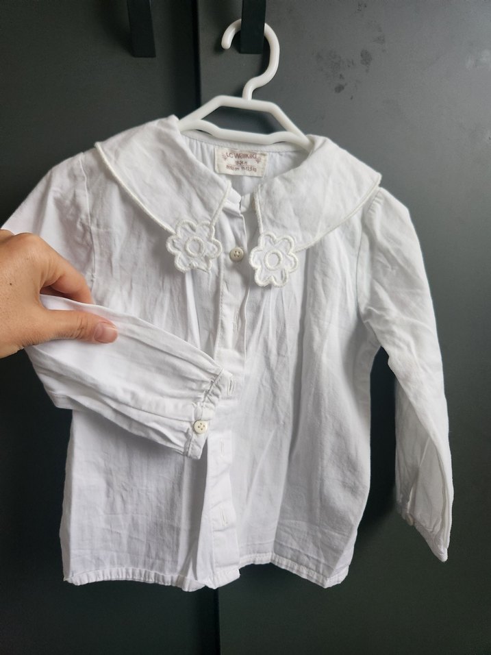 Nakışlı çiçek detaylı yakası ve düğmeli uzun kollu, kız çocuk gömleği. sayılı giyildi