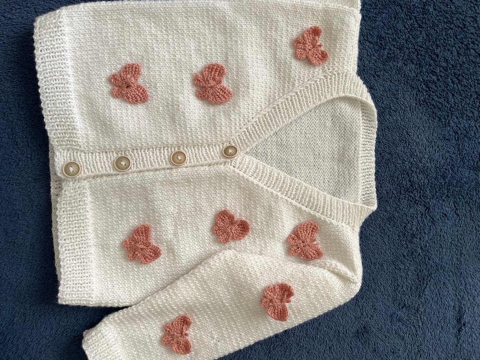 Nakışlı pembe kelebek detaylı, uzun kollu beyaz kız çocuk hırkası. Bol kesim ve bohem tarzda, yumuşak pastel renk tonlarında.