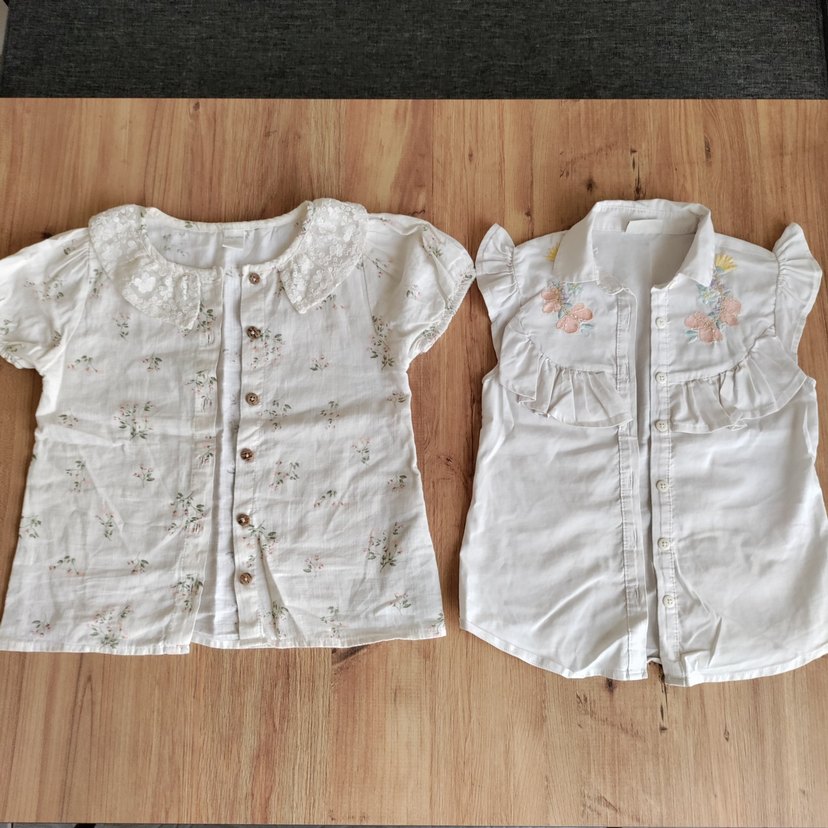 Pamuklu beyaz kız çocuk gömlekleri, kısa kollu ve düğmeli, nakışlı detaylarla. Bol kesim ve bohem tarzda.