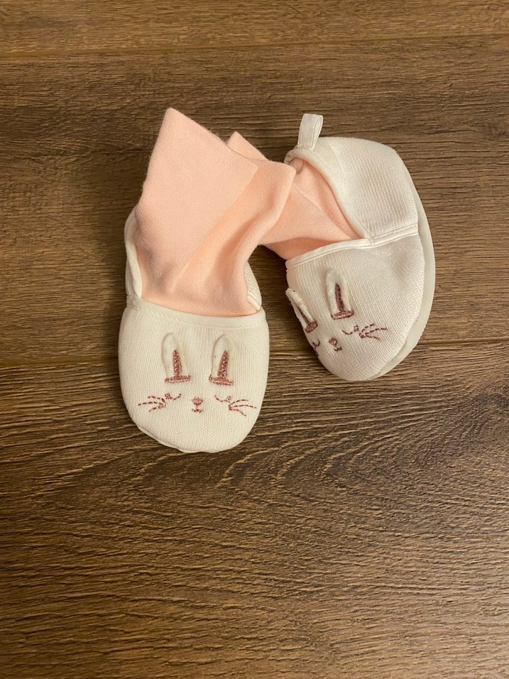 Nakışlı detaylara sahip beyaz kız çocuk örgü ev terlikleri, pastel tonlarda ve kauçuk tabanlıdır. Hiç kullanılmamıştır