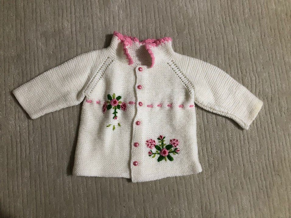 Uzun kollu, bol kesim beyaz örgü kız çocuk hırkası, pembe nakışlı çiçek desenleri ve düğmelerle bohem stil sunar. hiç giyilmedi. ölçüleri fotoğrafta mevcut. el örgüsü olduğu için beden veremiyorum.
