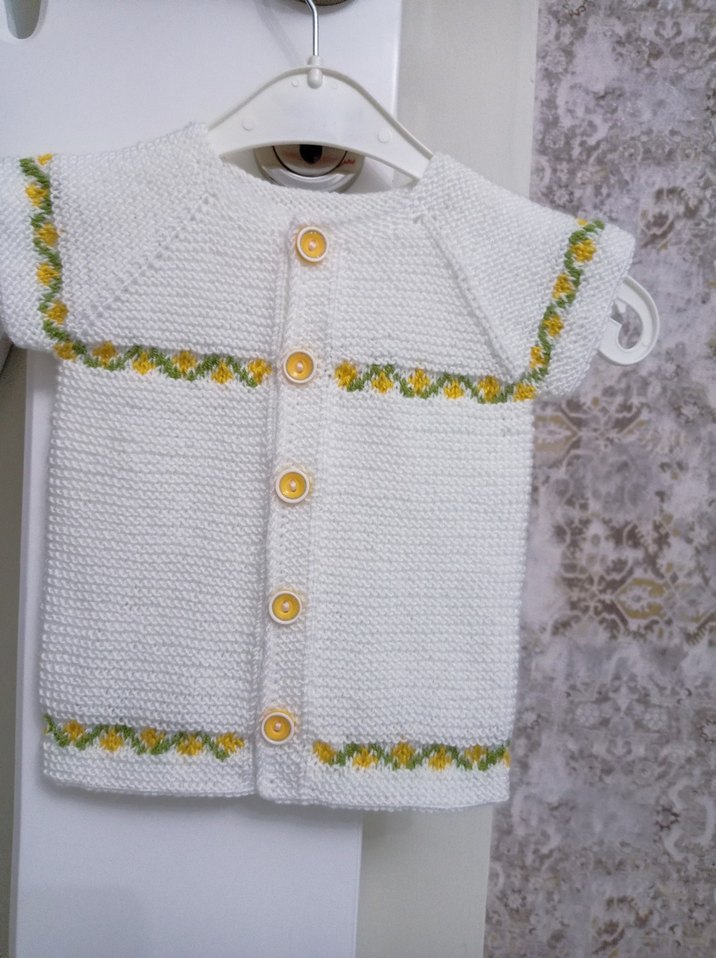 Beyaz renkli, nakışlı desenli ve düğmeli kız çocuk örgü yelek.En 24 cm.Boy 30 cm. Hediye arayanlara çok güzel bir ürün.Hem kız hem Erkek Bebeklere Uygun. #bebekyeleği #elörgüsüyelek #örgü #yelek #hediye #bebek #çocuk #örgü
