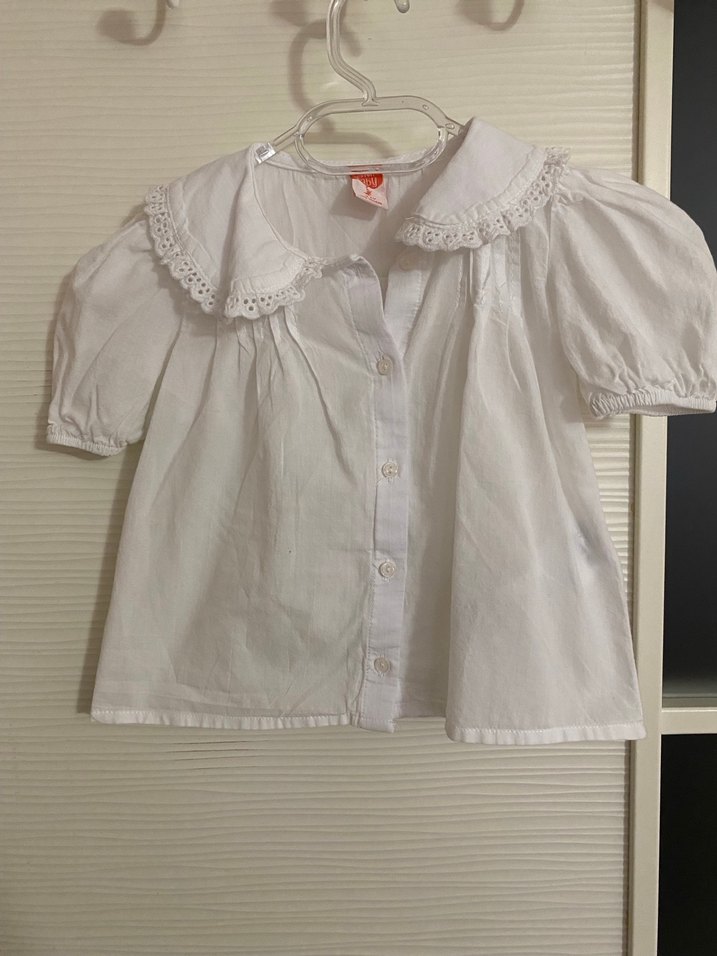 Kız çocuk pamuklu gömlek, kısa kollu, nakışlı yakalı ve düğmeli. Rahat kesimi ve beyaz rengiyle sade bir tarz sunar.