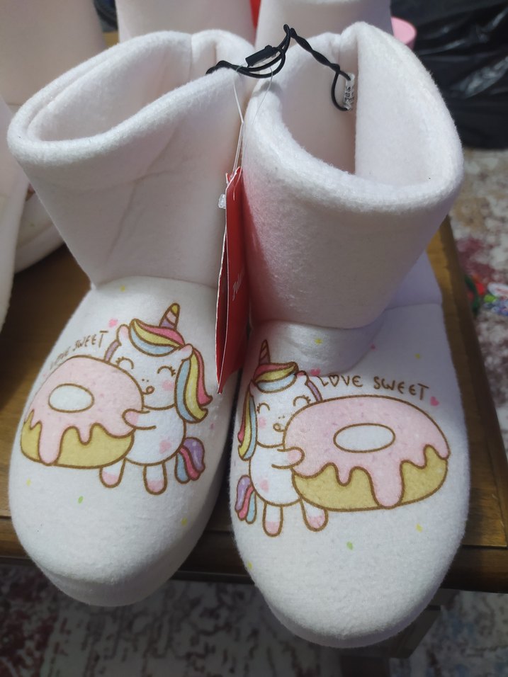 Nakışlı unicorn ve donut desenli, beyaz tüylü, kabarık kız çocuk terliği, rahat ve şık sokak stili için uygun.