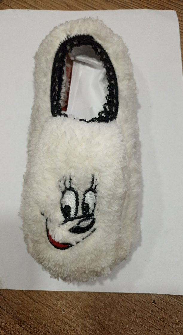 Renkli nakış detaylı, tüylü, yumuşak kumaştan yapılmış beyaz kız çocuk ev terliği, bohem ve retro tarzlar için uygun.