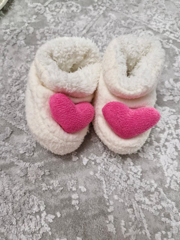 Nakışlı pembe kalpli, yumuşak ve sıcak kumaştan örme beyaz kız çocuk terliği.