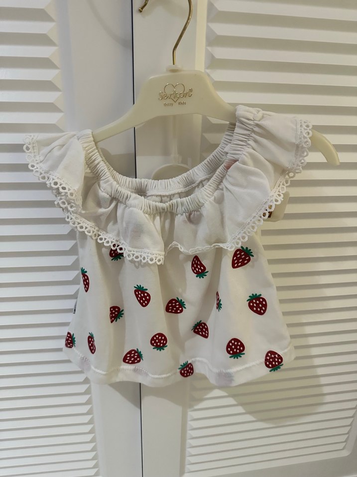Pamuklu, nakışlı çilek desenli, straplez ve fırfırlı yakaya sahip bol kesim beyaz kız çocuk bluz.