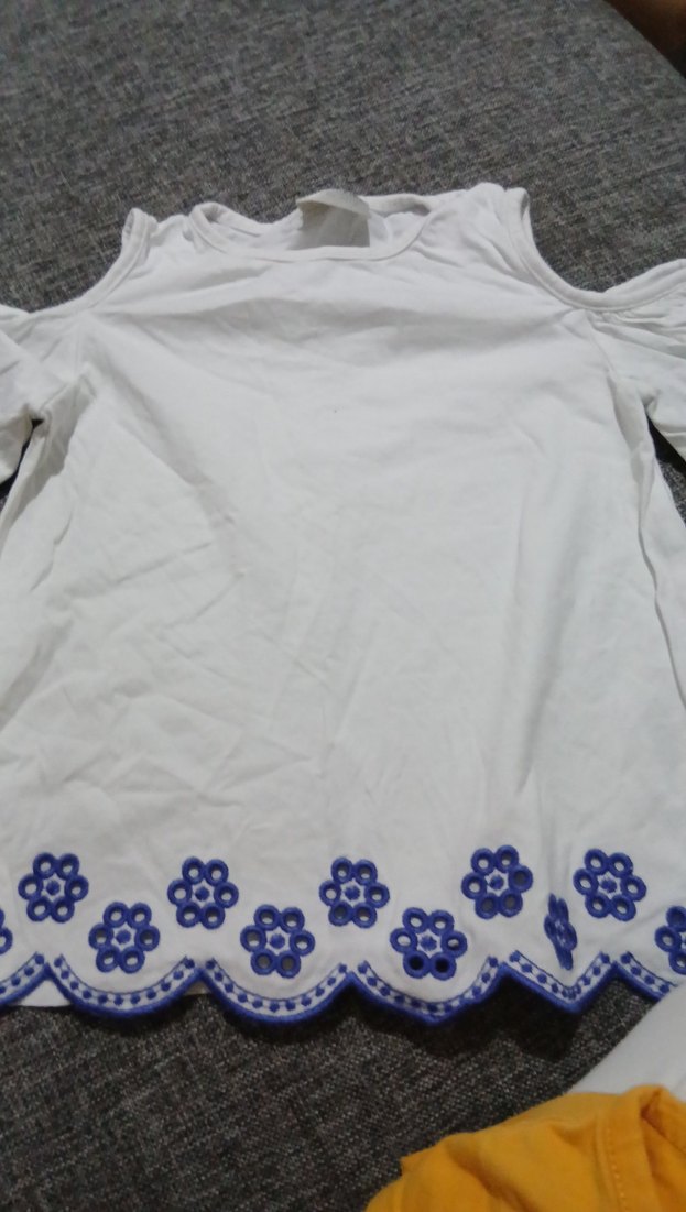 Nakışlı mavi çiçek desenli, fırfırlı beyaz pamuk kız çocuk tişörtü, yuvarlak yaka ve kısa kolludur.