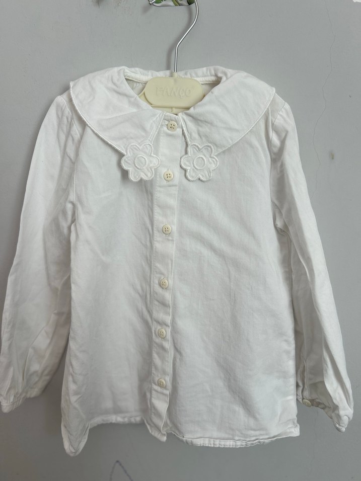 Etiketi yok kullanılmadı Nakışlı çiçek detaylı yakası ve düğmeli önüyle beyaz keten kız çocuk gömleği. Uzun kollu ve bol kesimdir.