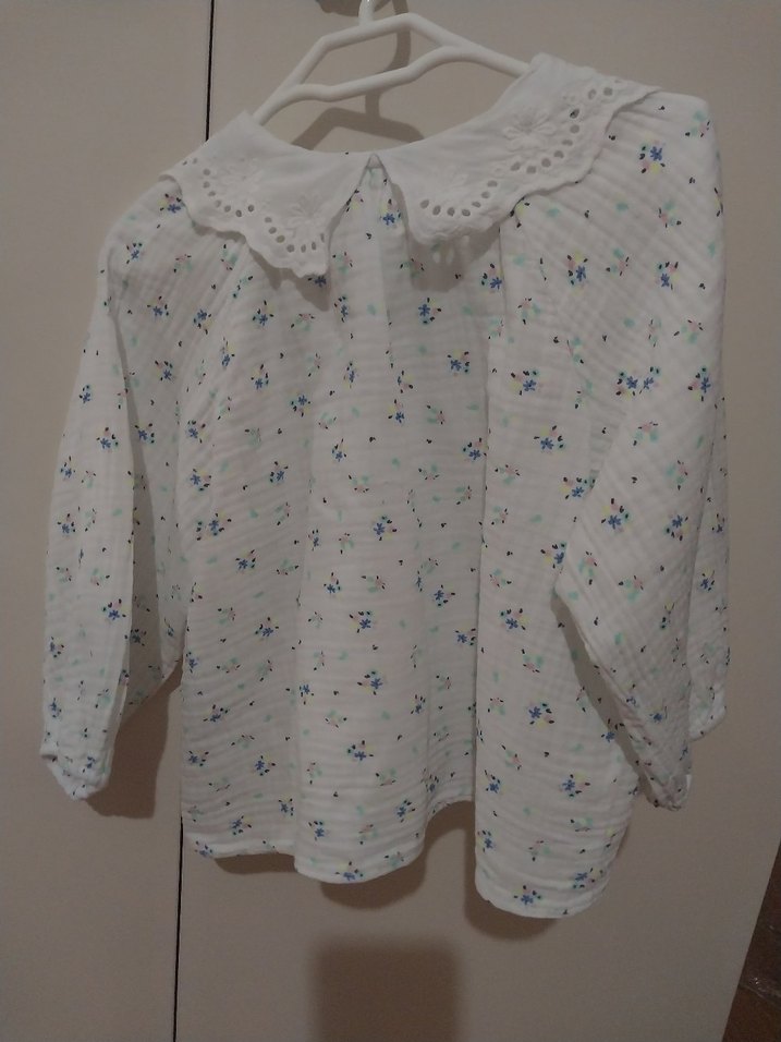 Pamuklu, uzun kollu, düğmeli, bol kesim, nakışlı pastel çiçek desenli beyaz kız gömleği. Müslüm kumas yakalı.