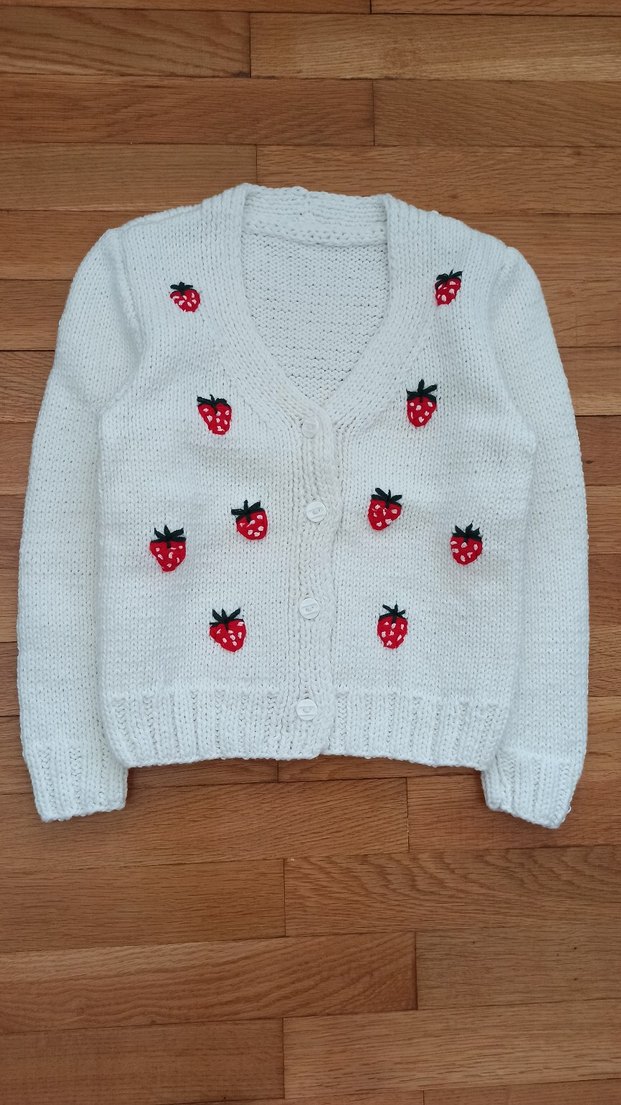Uzun kollu, beyaz örgü kız hırkası, nakışlı çilek desenleriyle bol kesim ve sokak modasına uygun tarzda.