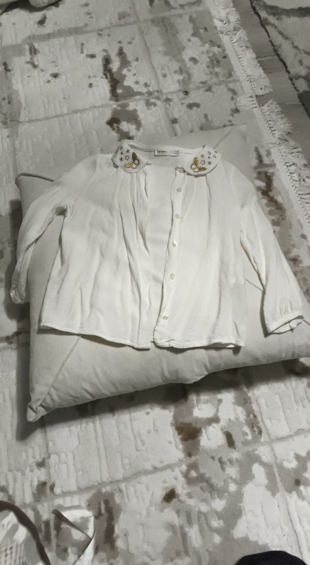 Uzun kollu, yakalı, düğmeli beyaz keten kız gömleği. Yaka kısmında ince nakış detaylarıyla bohem tarzı yansıtıyor.