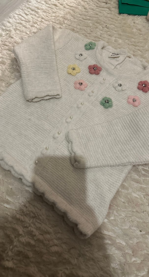 Uzun kollu, nakışlı pastel çiçekler ve inci detaylı beyaz fitted triko kız hırkası, bohem tarzda.