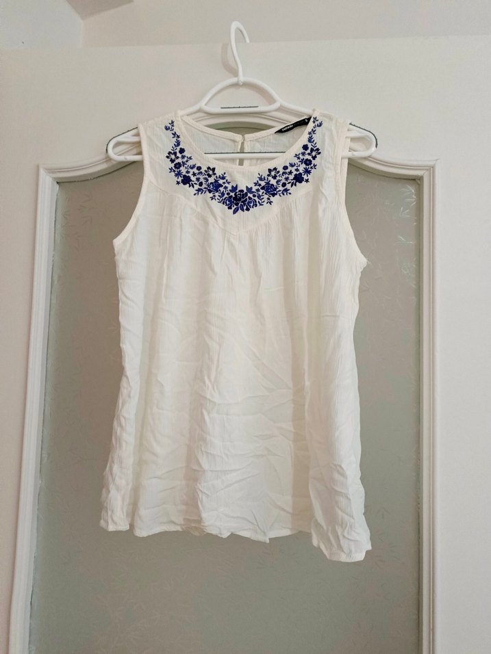 Nakışlı Beyaz Kolsuz Bohem Keten Bluz