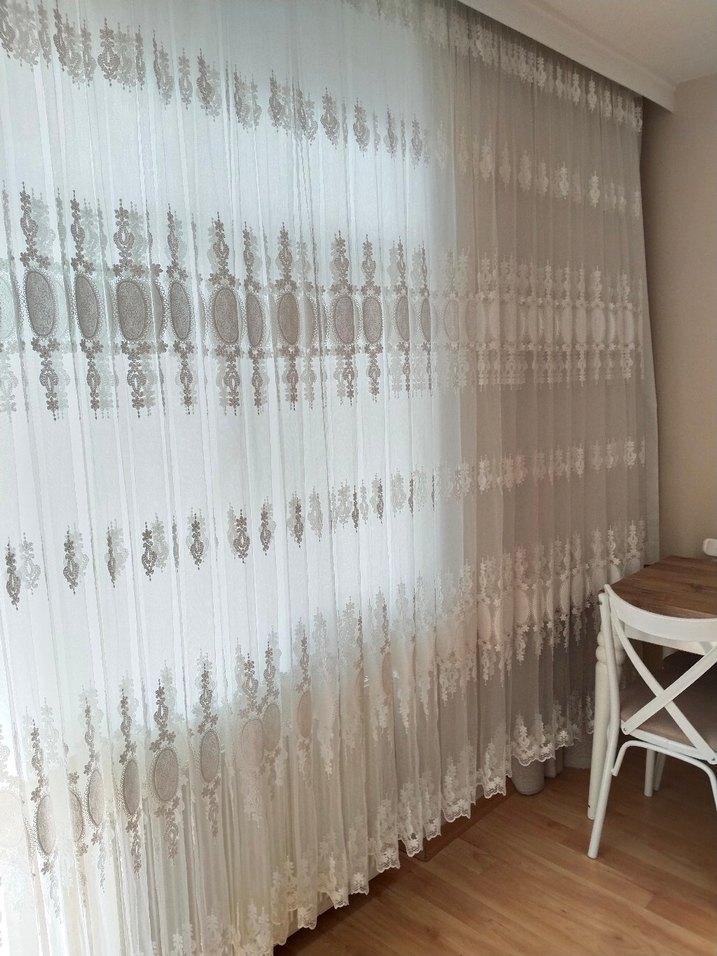 Bu beyaz konvansiyonel perde, hafif ve zarif bir dokunuş sağlayan ince nakışlı desenlere sahiptir.