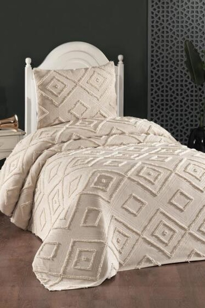 krem nakışlı geometrik desenlere sahip beyaz yatak örtüsü, yatak odasına dokulu ve şık bir görünüm sunar. Aynı desende yastık kılıfı dahildir. ️