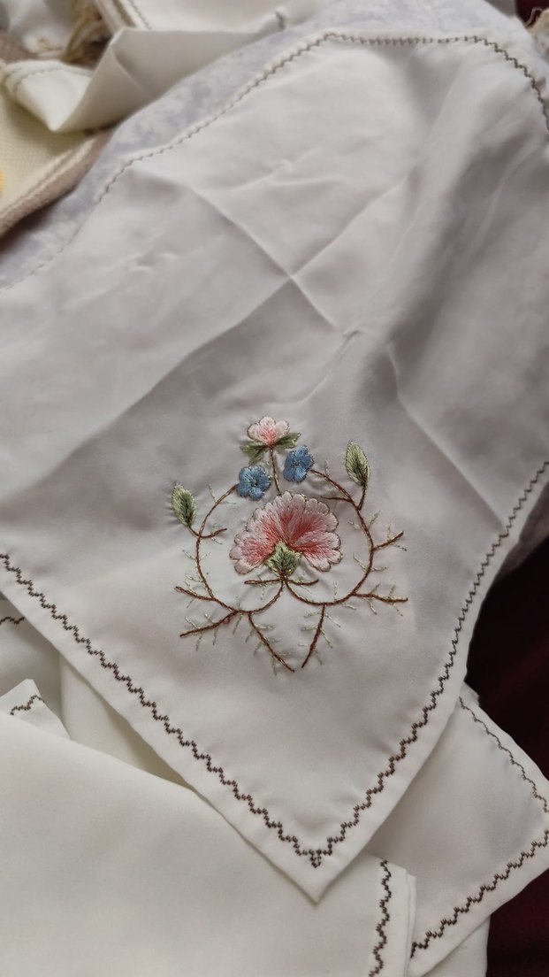 Bu beyaz masa örtüsü, pastel renklerde zarif nakışlı çiçek desenleriyle klasik bir dokunuş sunar. çin ignesidir 17 parcadir