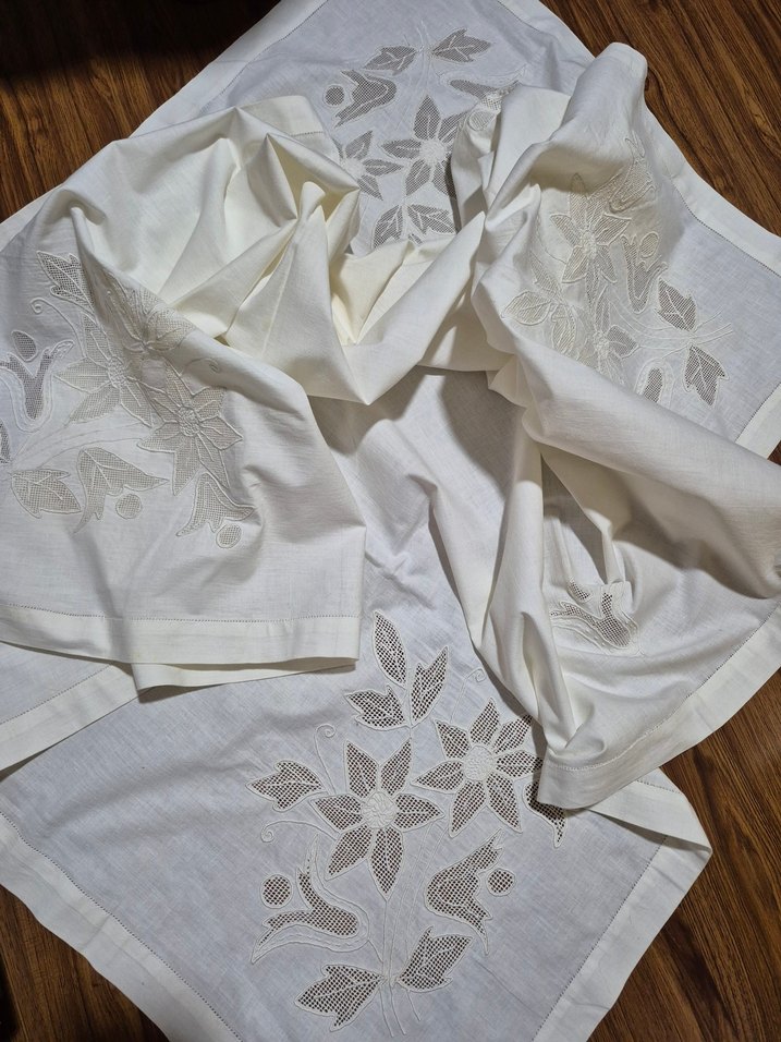 Bu beyaz masa örtüsü, zarif nakışlı çiçek desenlerine sahiptir ve geleneksel, şık bir görünüm sunar. Elişi, filtre ve sarma .. 135/135 cm