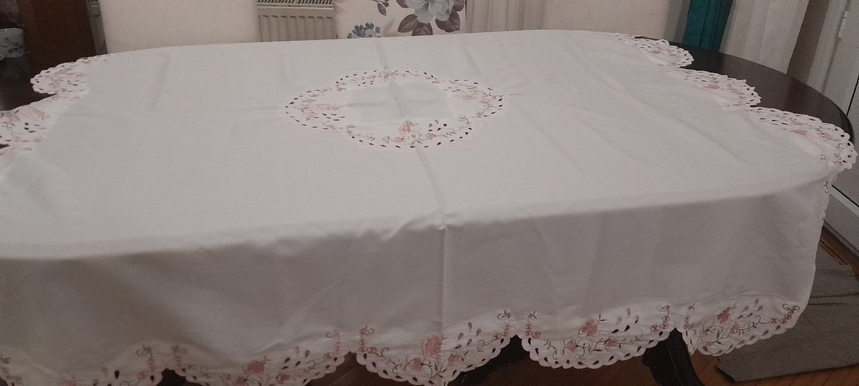 Bu pastel beyaz masa örtüsü, kenar ve ortasında zarif nakışlı çiçek desenlerine sahiptir. Geleneksel ve klasik bir stile sahiptir.