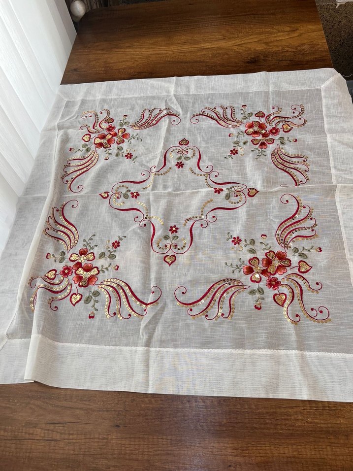 Bu beyaz masa örtüsü, kırmızı ve kahverengi tonlarda geleneksel nakışlı çiçek desenlerine sahiptir, klasik bir dokunuş katar.