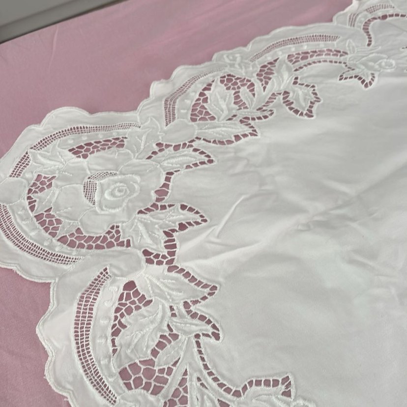 Nakışlı çiçek ve dantel detaylarıyla beyaz masa örtüsü, klasik bir görünüm sunar. El işçiliği detaylı, zarif güpürlü örtü / masa örtüsü. Kenarları oyalı, çiçek işlemeli ve kaliteli kumaştan üretilmiştir. İster sehpa örtüsü ister dekoratif amaçlı kullanabilirsiniz. Yeni ve hiç kullanılmadı. 92cm en boy