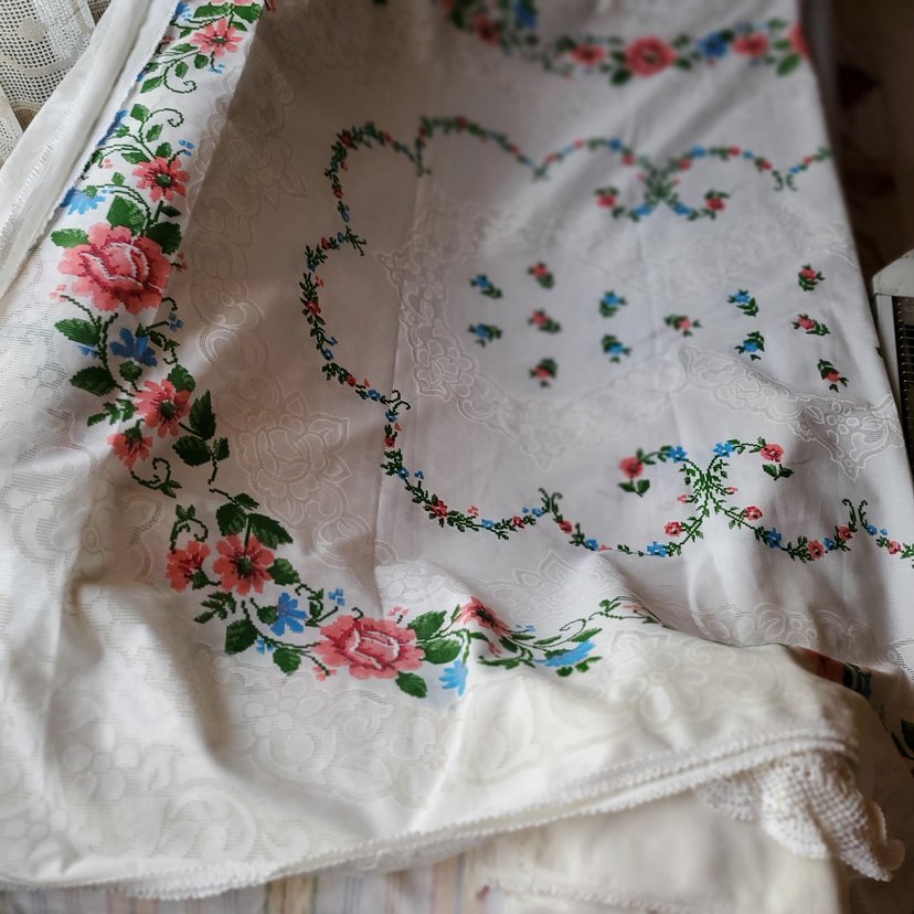 Pastel renklerde nakışlı çiçek desenleriyle süslenmiş beyaz masa örtüsü, klasik tarzda.