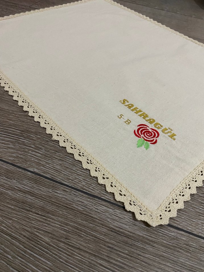 İsme özel nakışlı, kenarı dantelli beslenme örtüsü. Sipariş üzere hazırlanır.