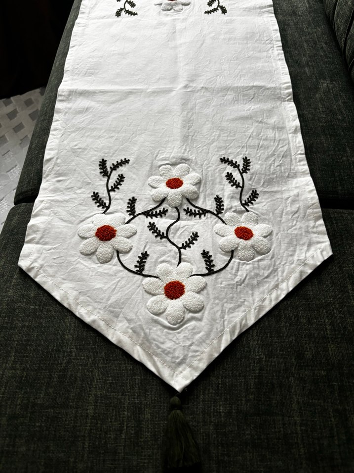 Koyu renklerde nakışlı çiçek desenleri bulunan, uç kısmı sivri ve püsküllü beyaz masa örtüsü.