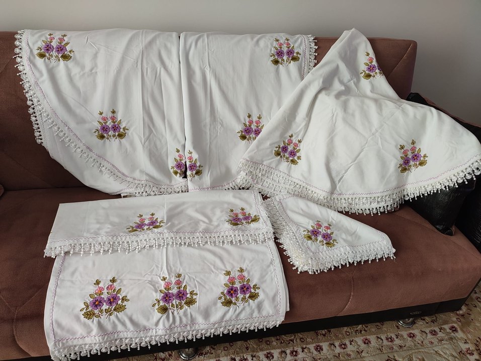 Makina nakışı yuvarlak masa örtüsü 2 adet perde buzdolabı örtüsü perdenin üzerine farba 8 adet peçete.