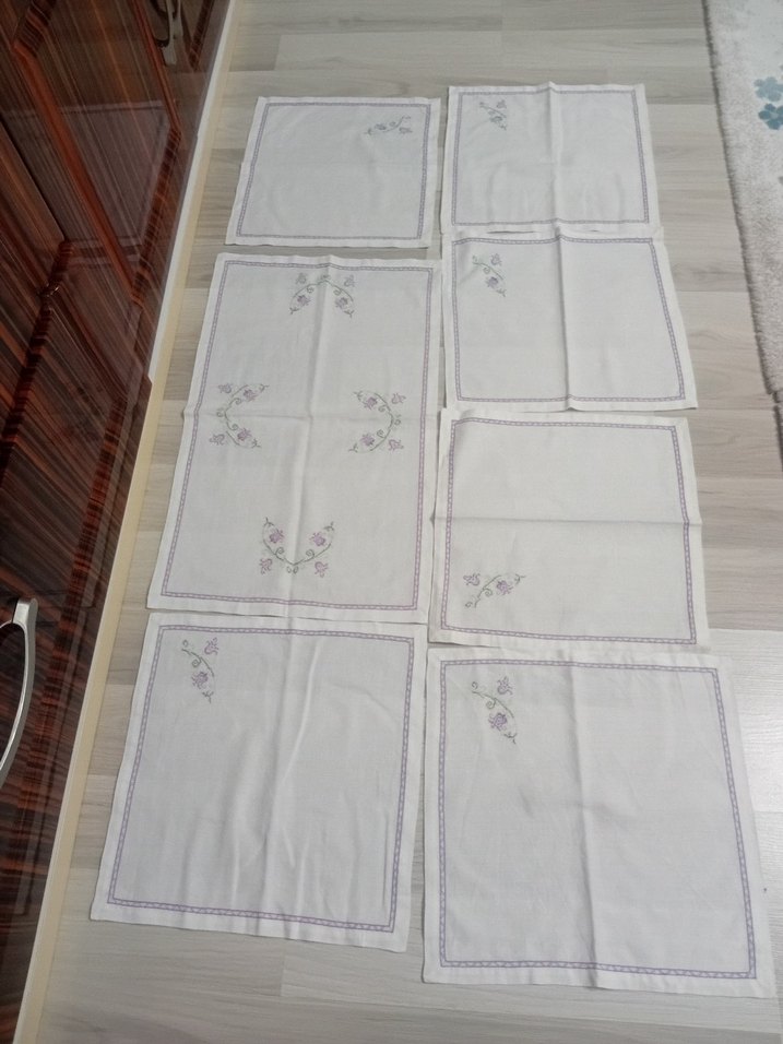 Narince işlenmiş çiçek desenleriyle süslenmiş beyaz masa örtüsü takımı, geleneksel tarzda, sofranıza zarif bir dokunuş katar.