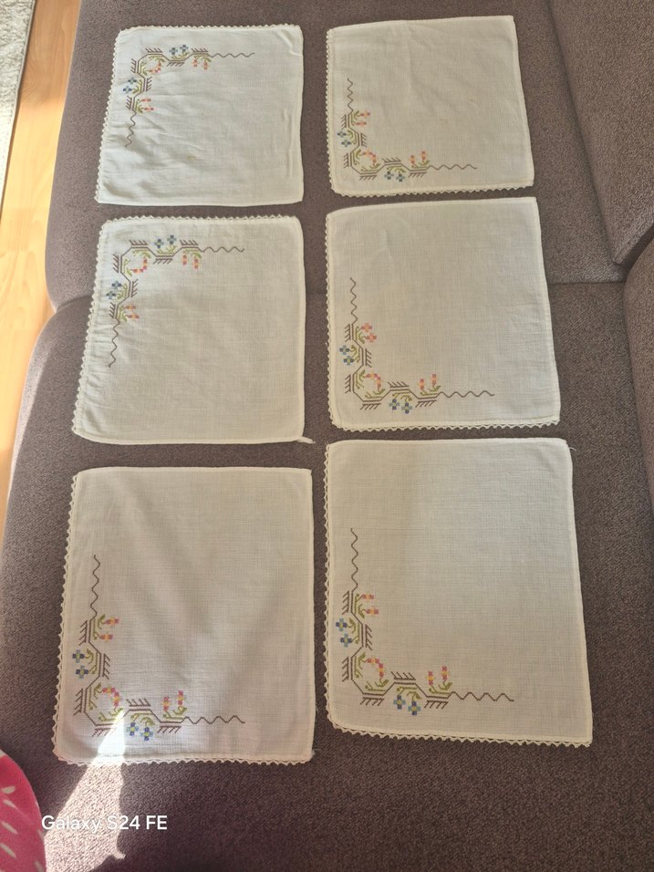 Bu set, pastel nakışlı çiçek desenleri ve tığ işi kenarlarıyla beyaz masa örtülerinden oluşur, geleneksel bir tarz sunar.