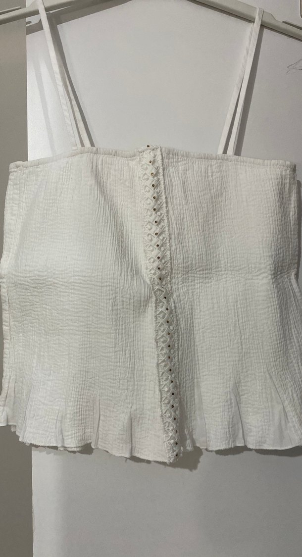 Nakışlı detaylara sahip beyaz büstiyer, gevşek kesim ve midi boyda. Alt kısmı ince pileli, ince askılı ve yumuşak dokulu kumaştan yapılmıştır. Bir kez giyilmiştir.