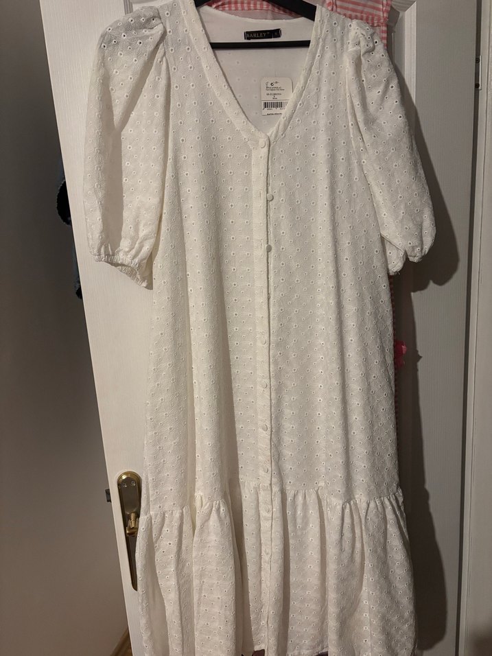 Nakışlı pamuklu kumaştan, kısa balon kollu, V yakalı, düğmeli, bol kesim beyaz midi elbise. Bohem tarzda, günlük kullanım için uygun.