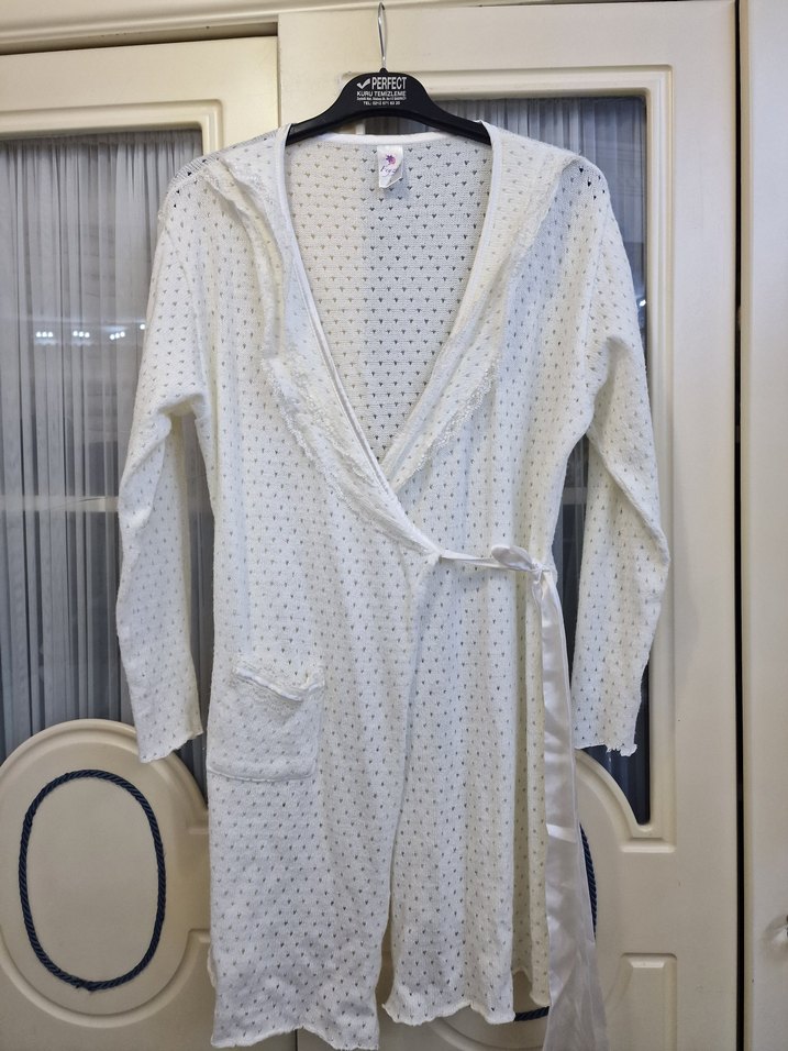 Uzun kollu, bol kesim beyaz midi kadın sabahlık. Nakışlı detaylar, bağcıklı kapanış ve cepli, rahat kullanıma uygun. ️