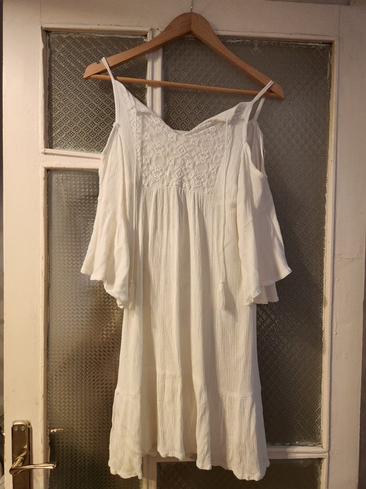 Nakışlı Beyaz Midi Keten Elbise