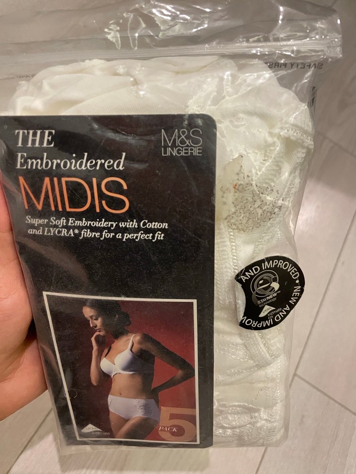 Pamuk ve LYCRA lifleriyle yumuşak nakışlı, beyaz, baskılı, normal midi boy, vücuda oturan külot. 5li paket fiyatıdır tek satılmaz hiç kullanılmadı
