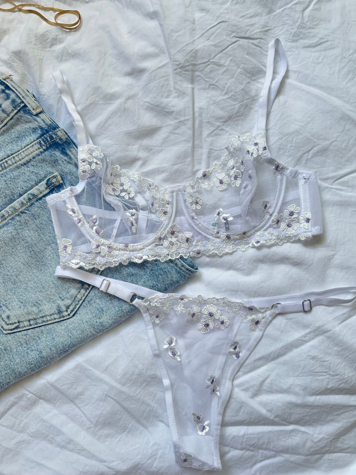 Nakışlı çiçek detayları ve midi uzunlukta tasarımıyla beyaz sütyen takımı, bohem ve Paris tarzını yansıtır. Pastel dokunuşlu zarif dantel detaylar içerir.