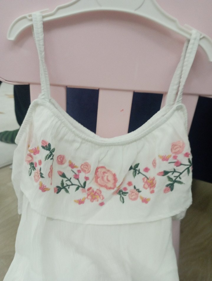 Çiçek nakışlı ve fırfırlı beyaz askılı mini bluz, hafif sentetik kumaştan. Bohem tarzda, bol kesim.
