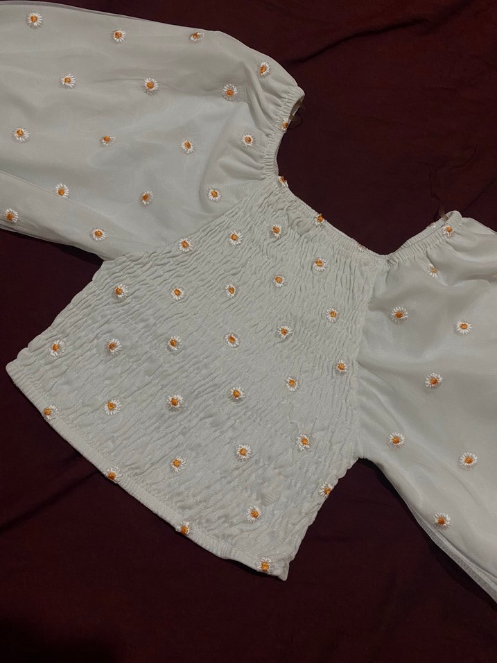 Nakışlı çiçek desenli beyaz mini bluz, tekne yaka, kısa balon kollu ve düğmeli detaylı. Sentetik kumaştan, bol kesim, günlük kullanıma uygun.