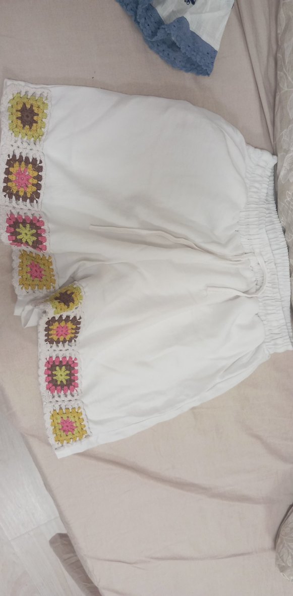 Nakışlı renkli fırfır detaylı beyaz örme mini şort, bol kesim, açık hava bohem tarzı için uygun.