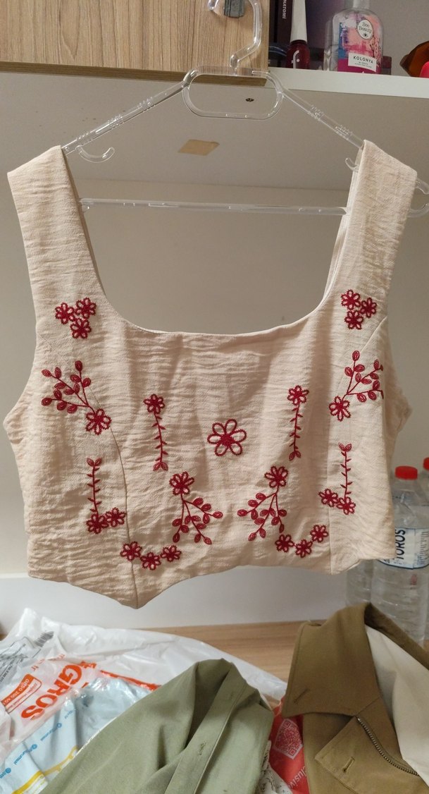 Hic giyilmedi, bedeni olmadığından satıyorum. Kırmızı nakışlı çiçek desenleri ve dantel detaylara sahip, askısız ve kısa mini boyda, bohem tarzında krem, vücuda oturan kolsuz yelek.