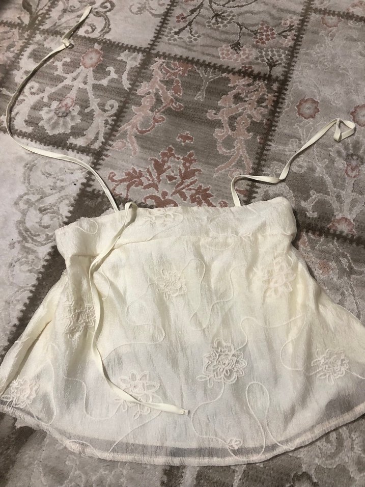 Nakışlı detaylara sahip beyaz hemşire korsesi, bol kesim ve kısa mini boydadır. Ayarlanabilir bağcıkları vardır.