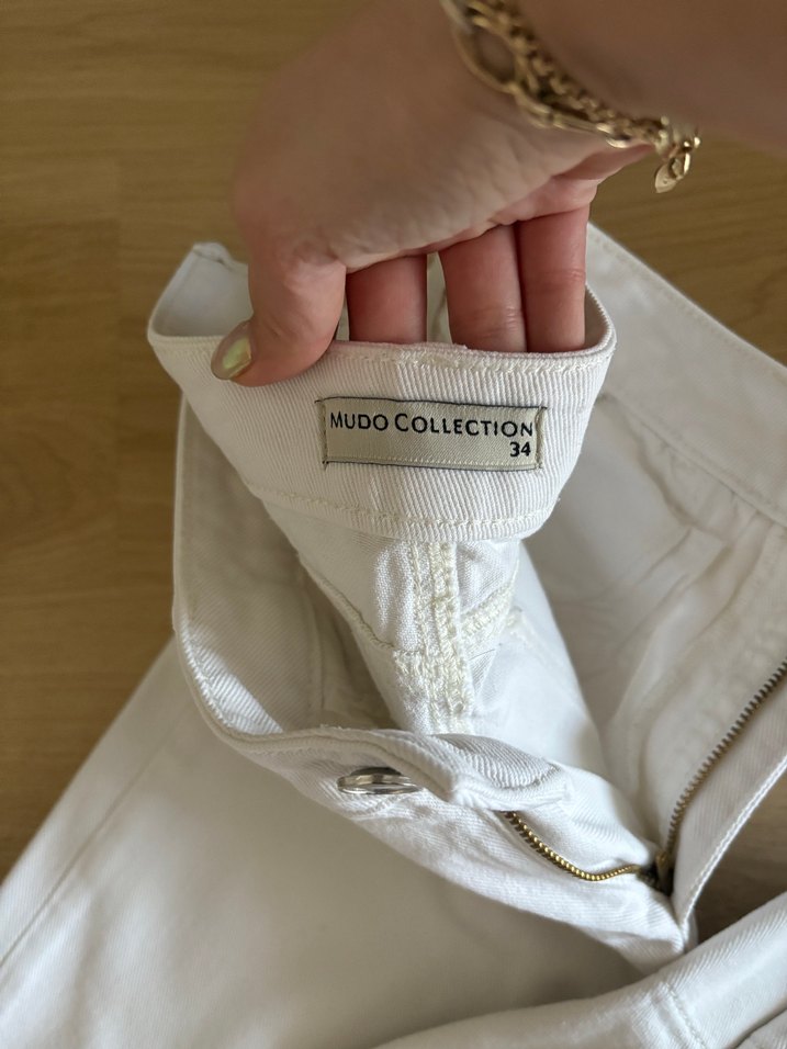 Pamuklu, fermuarlı, nakış detaylı beyaz mini kot pantolon. MUDO COLLECTION ürünü, günlük rahat kullanım için uygundur.