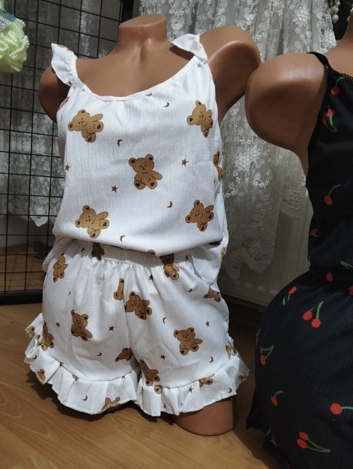 Nakışlı ayıcık desenli, beyaz renkli, kolsuz ve bol kesim mini pijama takımı. Fırfırlı şortlarıyla rahat ve şık bir görünüm sunar.