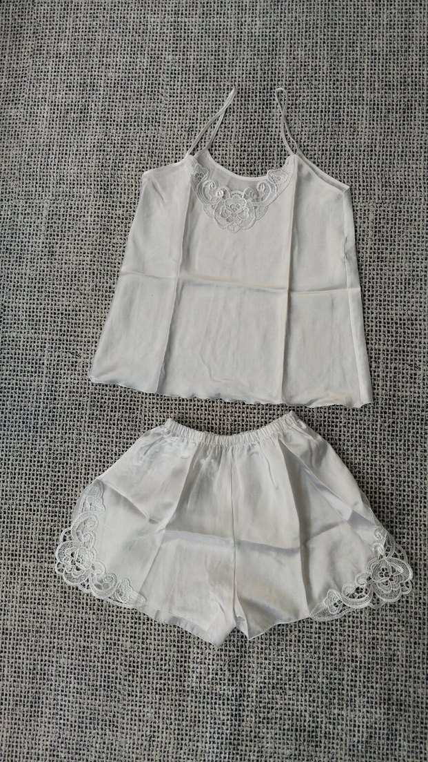 Nakış detaylı, askılı ve bol kesim üst ile nakışlı kenarlara sahip kısa beyaz şortlardan oluşan bohem vintage tarzda kadın pijama takımı.