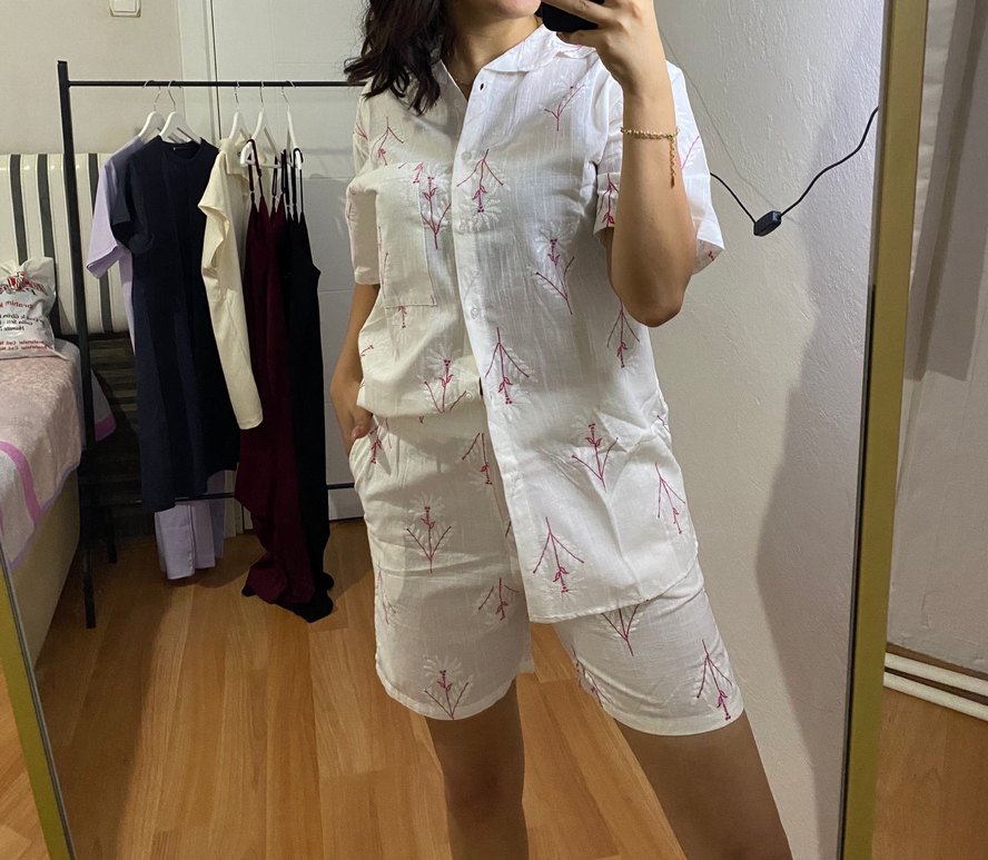 Nakışlı desenlere sahip, düğmeli, kısa kollu, V yakalı, pamuklu beyaz mini kadın tulum. Rahat kesimiyle günlük kullanıma uygundur.